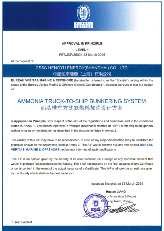 近日,中船物資恒宇能源公司氨燃料碼頭槽車式氨燃料加注設計方案獲AIP認證。項目研發團隊明確低溫液氨為加注介質,錨定核心研發方向,開展全面市場調研與行業摸排,持續深耕技術路徑探索,反復進行方案論證迭代,成功攻克多項技術瓶頸,最終形成安全可靠、高效便捷、可落地實施的技術方案,順利通過嚴苛評審。