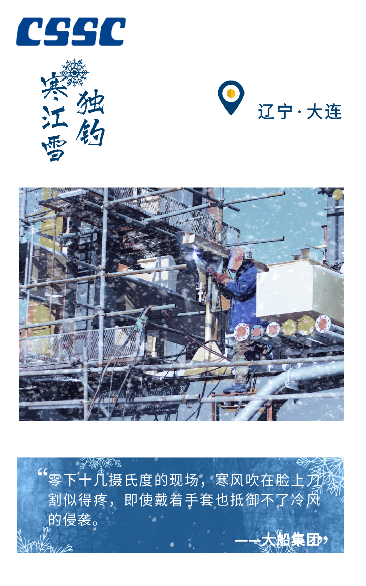 -5℃、-10℃、-20℃ …… 在這個(gè)不斷刷新寒冷指數(shù)的冬季 從未缺席中國(guó)船舶人勞作的身影 皎潔的白雪、火紅的爐膛 呼嘯的海風(fēng)、疾行的足音 奏響了冬季船舶人的 冰與火之歌