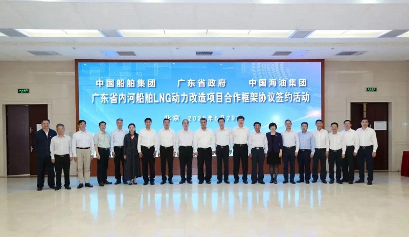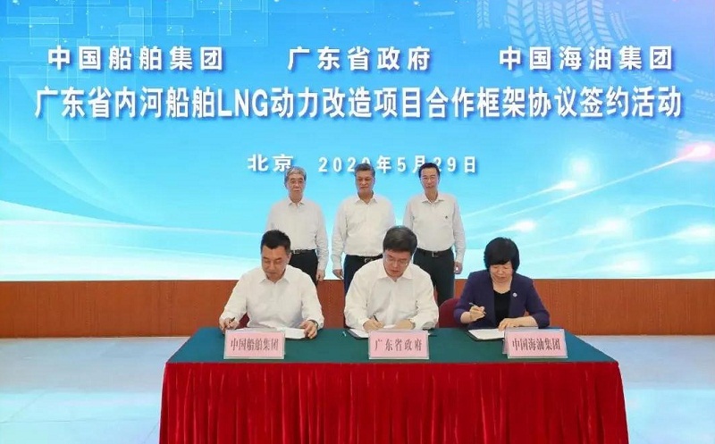 ????5月29日,中國(guó)船舶集團(tuán)有限公司與廣東省人民政府、中國(guó)海洋石油有限公司在京簽署《廣東省內(nèi)河船舶LNG動(dòng)力改造項(xiàng)目合作框架協(xié)議》。廣東省委副書(shū)記、省長(zhǎng)馬興瑞,中國(guó)船舶集團(tuán)黨組書(shū)記、董事長(zhǎng)雷凡培,中國(guó)海油黨組書(shū)記、董事長(zhǎng)汪東進(jìn),中國(guó)船舶集團(tuán)黨組成員、副總經(jīng)理杜剛,中國(guó)海油黨組成員、副總經(jīng)理陳壁出席簽約儀式。廣東省副省長(zhǎng)覃偉中,中國(guó)船舶集團(tuán)黨組成員、副總經(jīng)理孫偉,中國(guó)海油黨組成員、總會(huì)計(jì)師溫冬芬分別代表各方在協(xié)議上簽字。