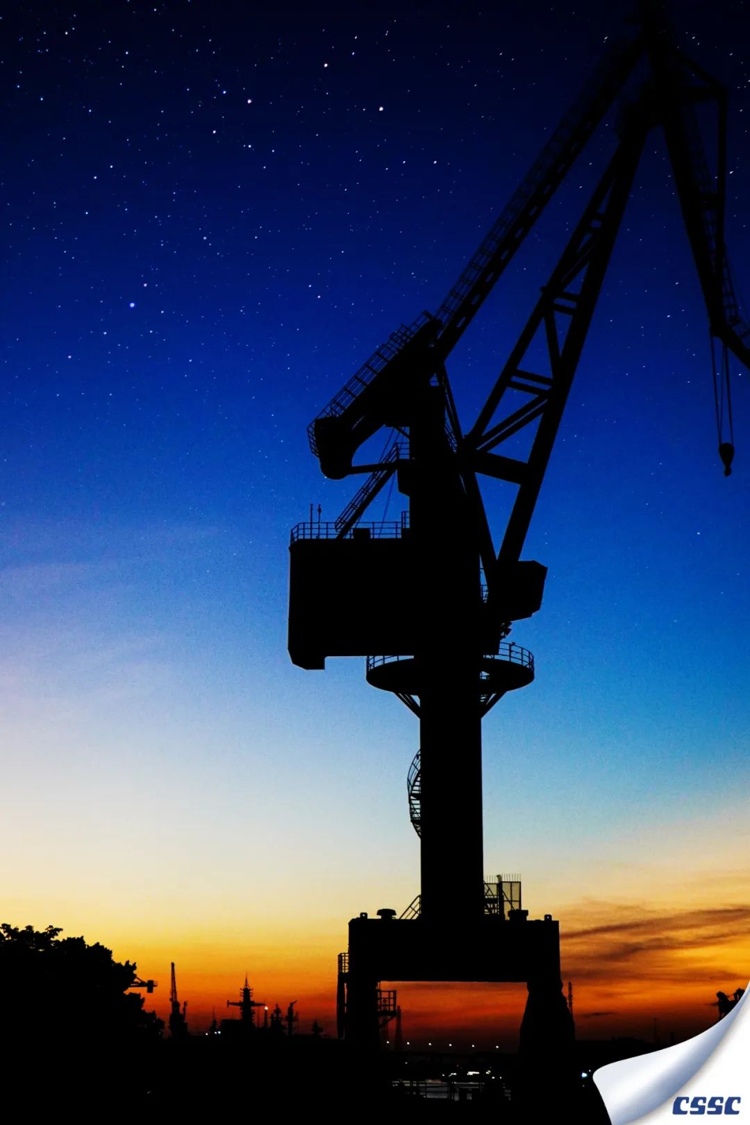 雖與巨輪不同,但船舶生產(chǎn)場(chǎng)地的起重器械亦可稱大國重器。此圖拍攝于2022年2月11日黃埔文沖,恰逢黃昏與星夜交替,器械與船舶共舞。舉起相機(jī)對(duì)著夕陽,記錄下這美好的時(shí)刻,以剪影的形式表現(xiàn)工作中的船舶風(fēng)景。