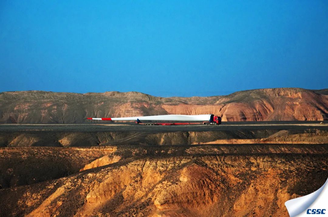 虎年開年, 中國海裝首臺(tái)H155-5MW機(jī)組在百里風(fēng)區(qū)——新疆哈密成功完成吊裝,該機(jī)組是新疆哈密目前單機(jī)容量最大的風(fēng)電機(jī)組。圖為超大型風(fēng)葉運(yùn)輸過程的縮影。