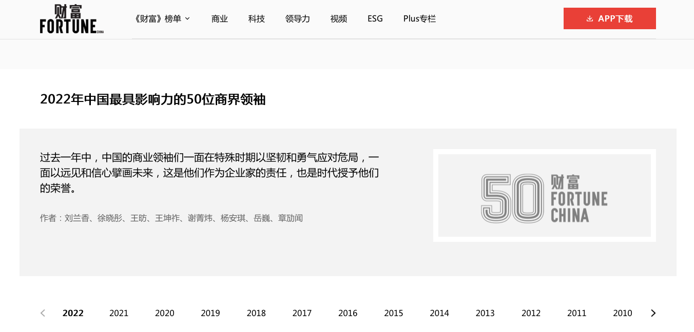 據(jù)了解,《財富》于2005年開始評選“中國最具影響力的商界領(lǐng)袖”。