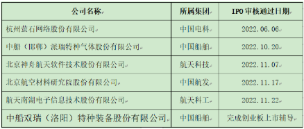 2022年的資本市場,行情不熱行業(yè)熱。從已經(jīng)公開披露的信息看,2022年中央企業(yè)專精特新小巨人在科創(chuàng)板和創(chuàng)業(yè)板持續(xù)發(fā)力,目前已有中無人機(航空工業(yè))、國博電子(中國電科)、振華風光(中國電子)、昆船智能等7家企業(yè)IPO上市。此外,截至2022年11月30日,已有多家央企專精特新企業(yè)IPO申請通過了科創(chuàng)板上市委審核和創(chuàng)業(yè)板上市輔導(dǎo),其中有兩家中國船舶集團旗下企業(yè)(見下表)。這些企業(yè)將在2023年IPO上市,主要來自船舶、航空、航天和軍工電子行業(yè)。