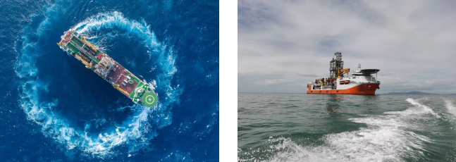 # 通過配置最先進的DP-3級動力定位系統,自動調整船舶底部7臺推進器的轉向和推力大小,來抵抗海上風、浪、流作用在船上的載荷,使船舶在海上保持一定的水平位置;