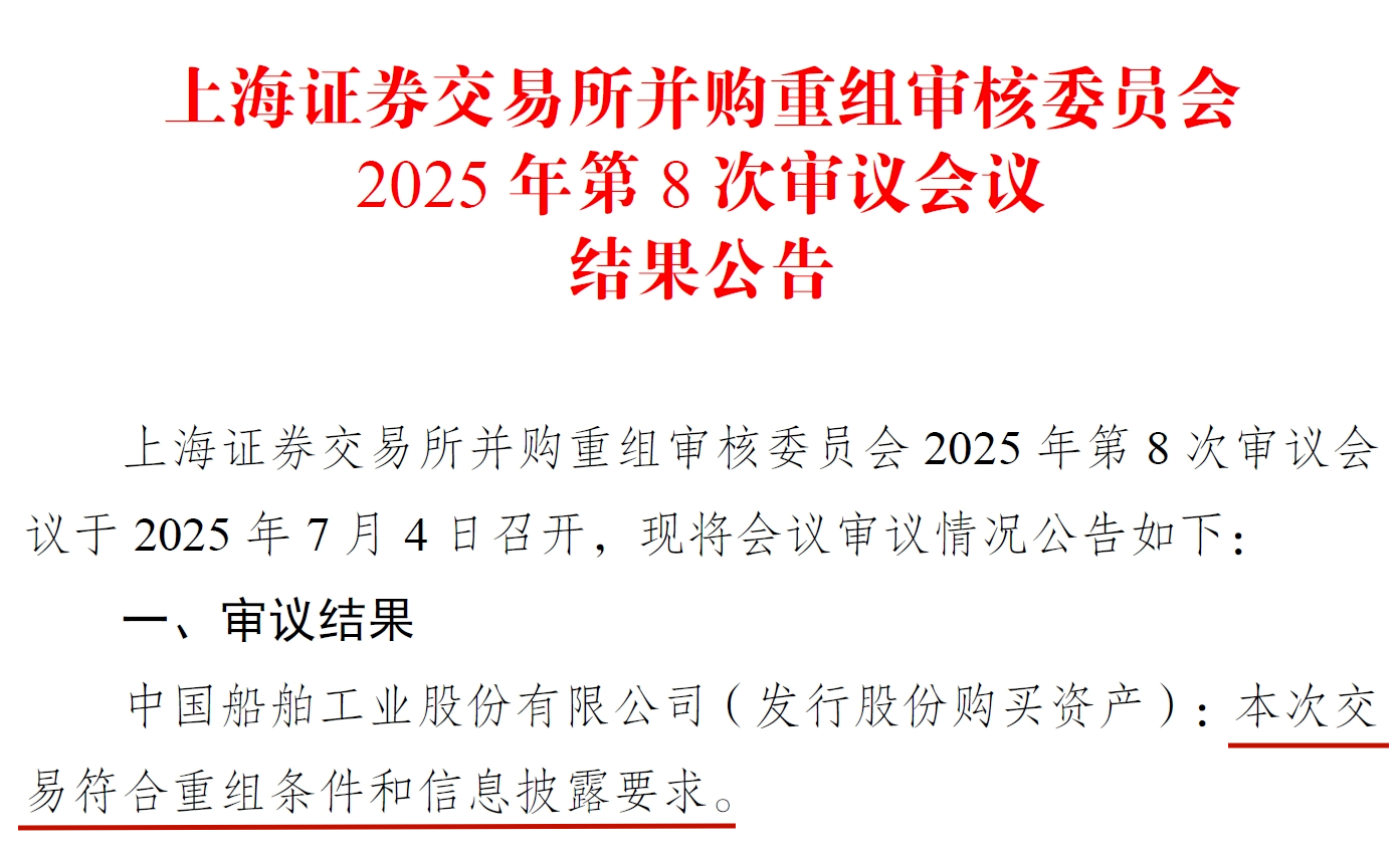 7月4日,上海證券交易所并購重組審核委員會2025年第8次審議會議召開,審議結果為中國船舶工業股份有限公司(發行股份購買資產):本次交易符合重組條件和信息披露要求。