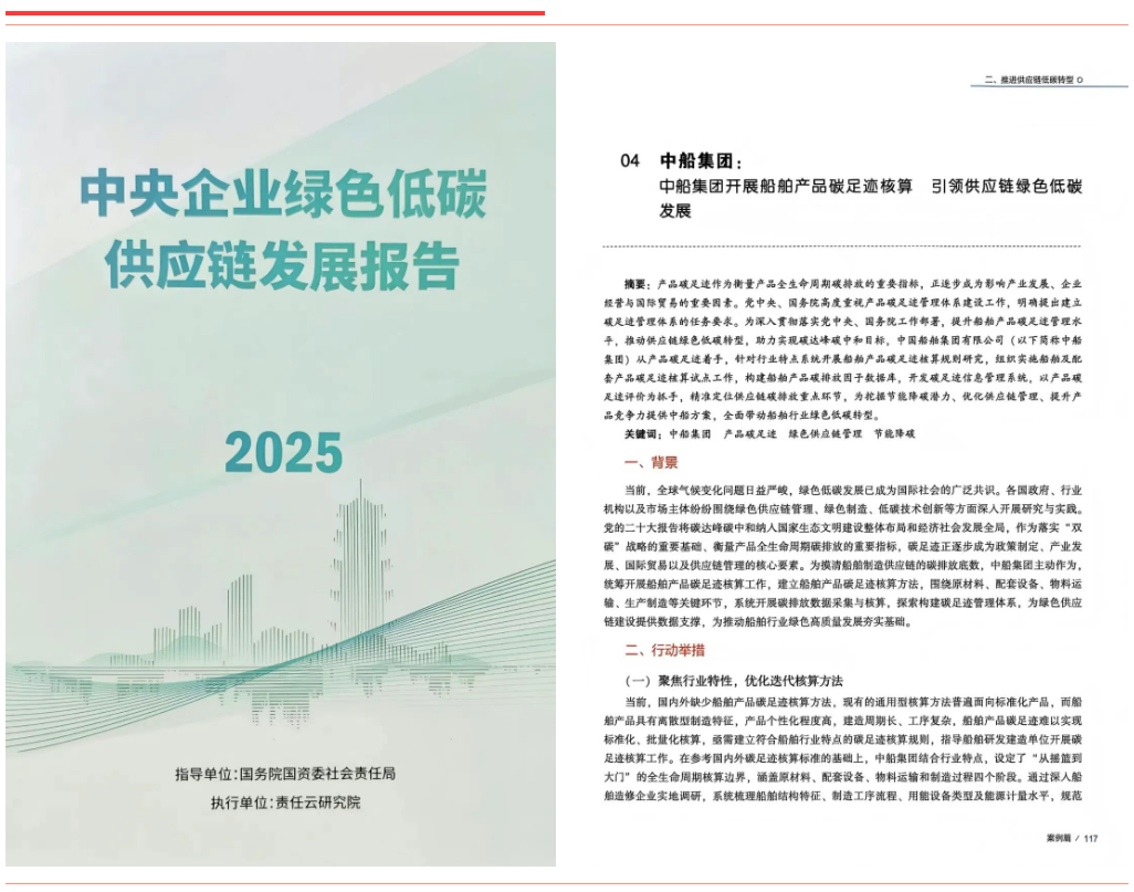 《中船集團開展船舶產(chǎn)品碳足跡核算引領綠色供應鏈低碳發(fā)展》聚焦船舶產(chǎn)品全生命周期碳足跡核算,構(gòu)建了行業(yè)首套核算規(guī)則與數(shù)據(jù)庫,有效帶動供應鏈上下游協(xié)同減排。該案例入選《中央企業(yè)綠色低碳供應鏈發(fā)展報告(2025)》。