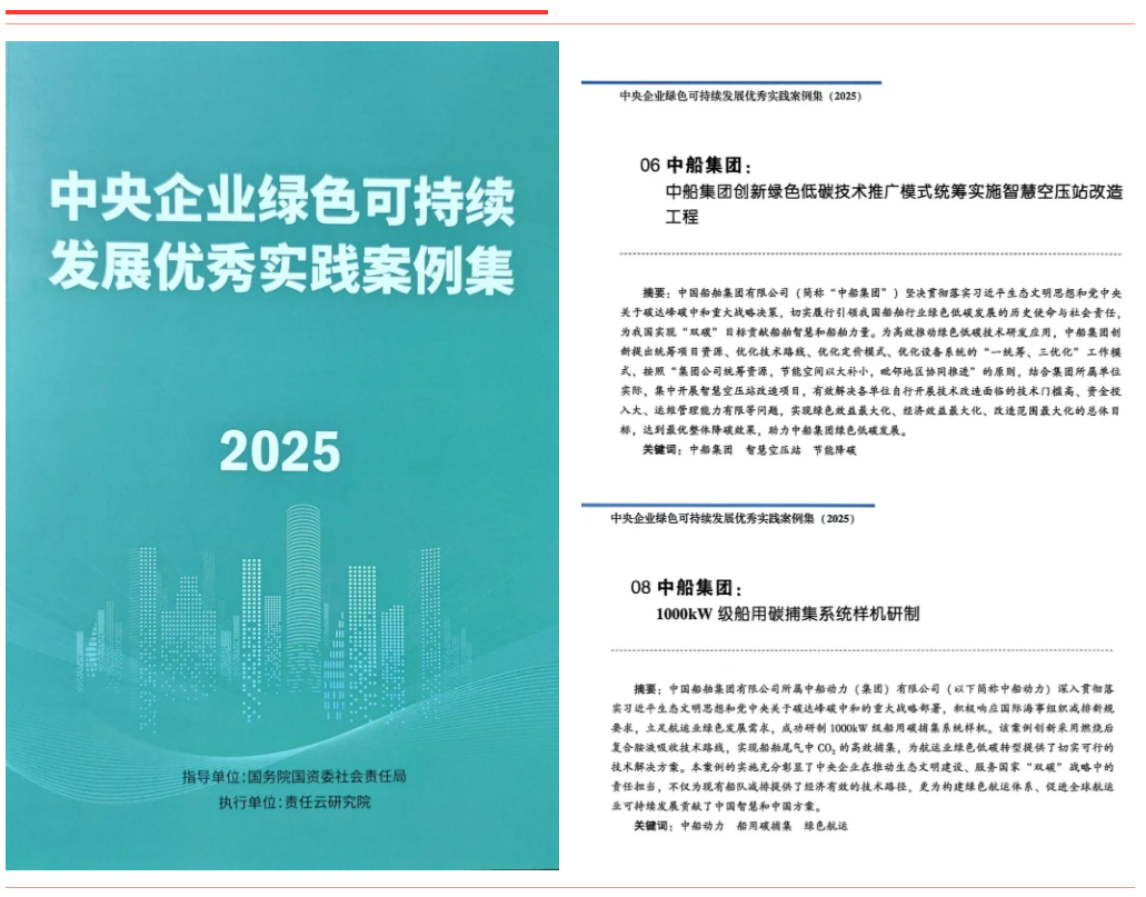 《中船集團創(chuàng)新綠色低碳技術推廣模式 統(tǒng)籌實施智慧空壓站改造工程》通過系統(tǒng)推進智慧空壓站改造,創(chuàng)新“一統(tǒng)籌、三優(yōu)化”模式,大幅提升設備能效。《中船動力1000kW級船用碳捕集系統(tǒng)樣機研制》圍繞船用碳捕集關鍵技術開展攻關,采用燃燒后復合胺吸收工藝,實現(xiàn)CO?捕集率超85%、純度達99.9%。上述兩項案例入選《中央企業(yè)綠色可持續(xù)發(fā)展優(yōu)秀實踐案例集(2025)》。