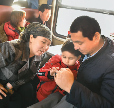 11月25日,在新疆塔克拉瑪干沙漠西南緣的喀什-和田對開火車“和田玉龍?zhí)枴鄙?,旅客們正在休息。(趙 戈 攝)