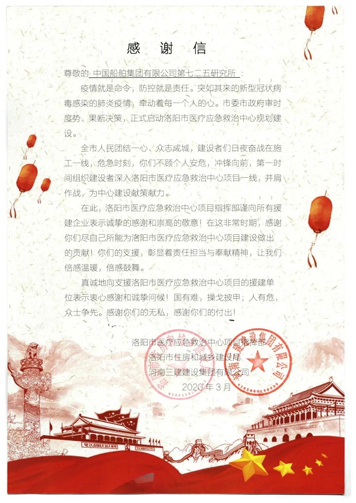 ????近日,中國船舶集團七二五所收到洛陽市醫(yī)療應急救治中心項目指揮部發(fā)來的感謝信,中國船舶集團旗下江蘇自動化研究所向英國合作單位寄送慰問函與防疫物資。洛陽市醫(yī)療應急救治中心項目指揮部,對七二五所在新冠肺炎疫情期間支援建設,洛陽市醫(yī)療應急救治中心項目建設作出的貢獻表示感謝。