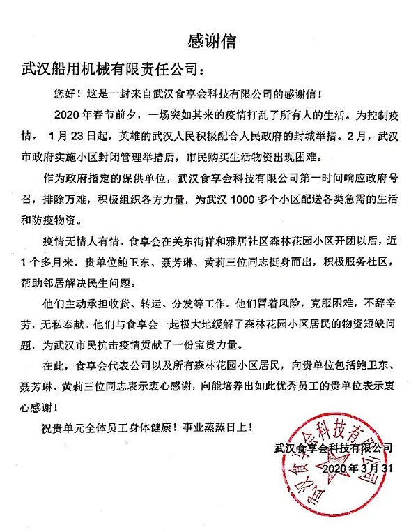 ????中國船舶集團(tuán)旗下武漢船機(jī),收到武漢食享會科技公司發(fā)來的感謝信,信中對武漢船機(jī)員工挺身而出,主動擔(dān)任武漢社區(qū)志愿者不畏艱險、無私奉獻(xiàn),為抗擊疫情貢獻(xiàn)力量表示敬佩和感謝。
