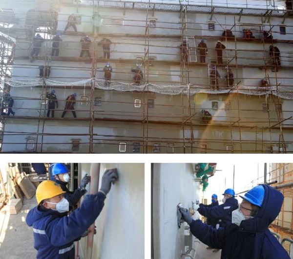 為確保該船按期實(shí)現(xiàn)試航節(jié)點(diǎn),大船集團(tuán)山船重工先后組織150余名黨員干部投入到該船生活區(qū)外板拉毛工程中。黨員們根據(jù)所分配的區(qū)域,站在十幾米高的腳手架上,手里拿著磨砂紙,一點(diǎn)一點(diǎn)地磨,一塊一塊地蹭,不放過每個(gè)細(xì)節(jié)。