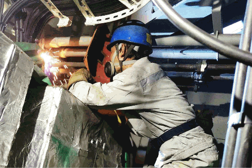 為保證臺風來臨前能夠進入錨地安全拋錨,大連公司海工公司員工戰高溫搶節點,狹小的空間里進行焊接作業。