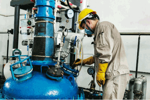 在原料藥車間,七一六所杰瑞藥業員工細心查看反應釜內物料反應情況。此時釜內溫度高達124.8℃,近身溫度超過50℃,全程反應時間約3~4小時。