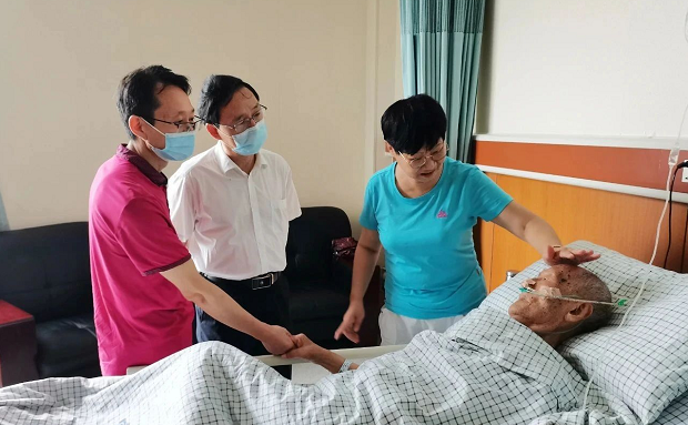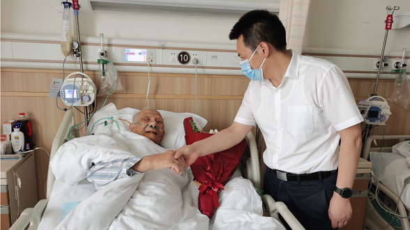 七二六所黨委副書記帶隊前往醫院看望慰問了在醫院住院治療的離休干部紀炎輝,向他致以崇高的敬意和親切的問候,并送上慰問金。