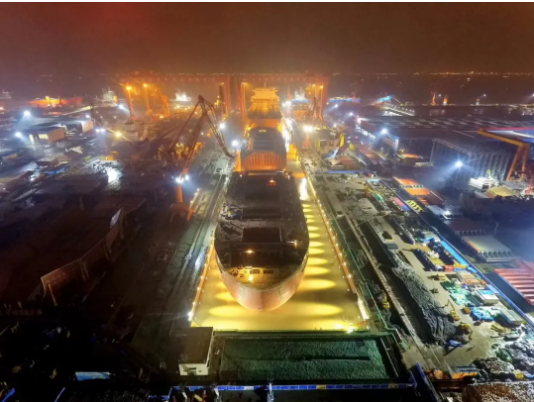 ——第二次改造,2018年10月至2020年6月,再次接長200米,建成后總長達740米。通過中間塢門分別形成前后兩個獨立塢室,以滿足年產(chǎn)1.5艘大型郵輪及3艘VLCC綱領(lǐng)產(chǎn)品要求。