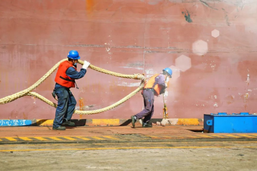 下午驕陽似火,修船碼頭帶纜工人正在給剛剛靠泊的船舶帶纜繩。