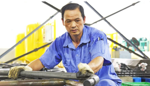 高壓油管車間,汗流浹背的操作工人正在操作彎管機加工高壓油管。