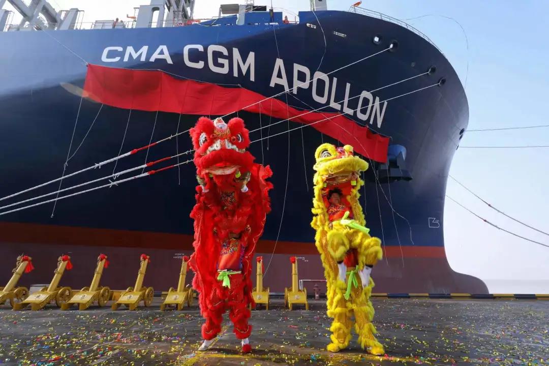 1月4日,新年第一個工作日。滬東中華聯合中船貿易為法國達飛海運集團建造的第四艘15000TEU超大型集裝箱船系列船“達飛·阿波羅”號在上海命名交付。