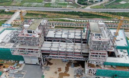 101#總部研發(fā)大樓是湛江灣實驗室一期項目的核心工程,其上部重達1.8萬噸的主體結構由53.4米跨度的轉換桁架承托。該轉換桁架是世界現有的第二大跨度轉換結構,同時與轉換桁架兩端相連的雙層鋼板剪力墻核心筒也是實現該建筑結構設計的關鍵部位。