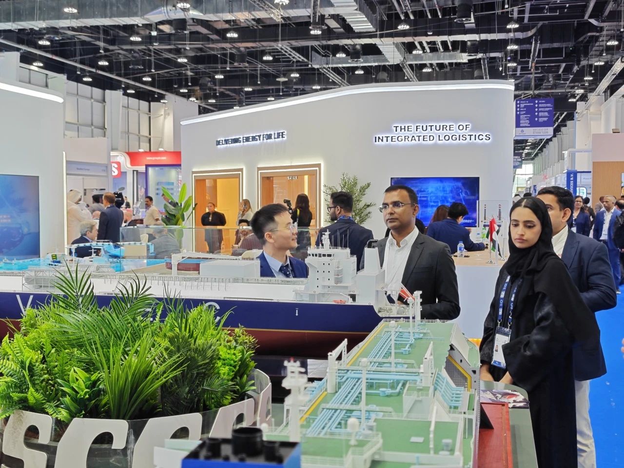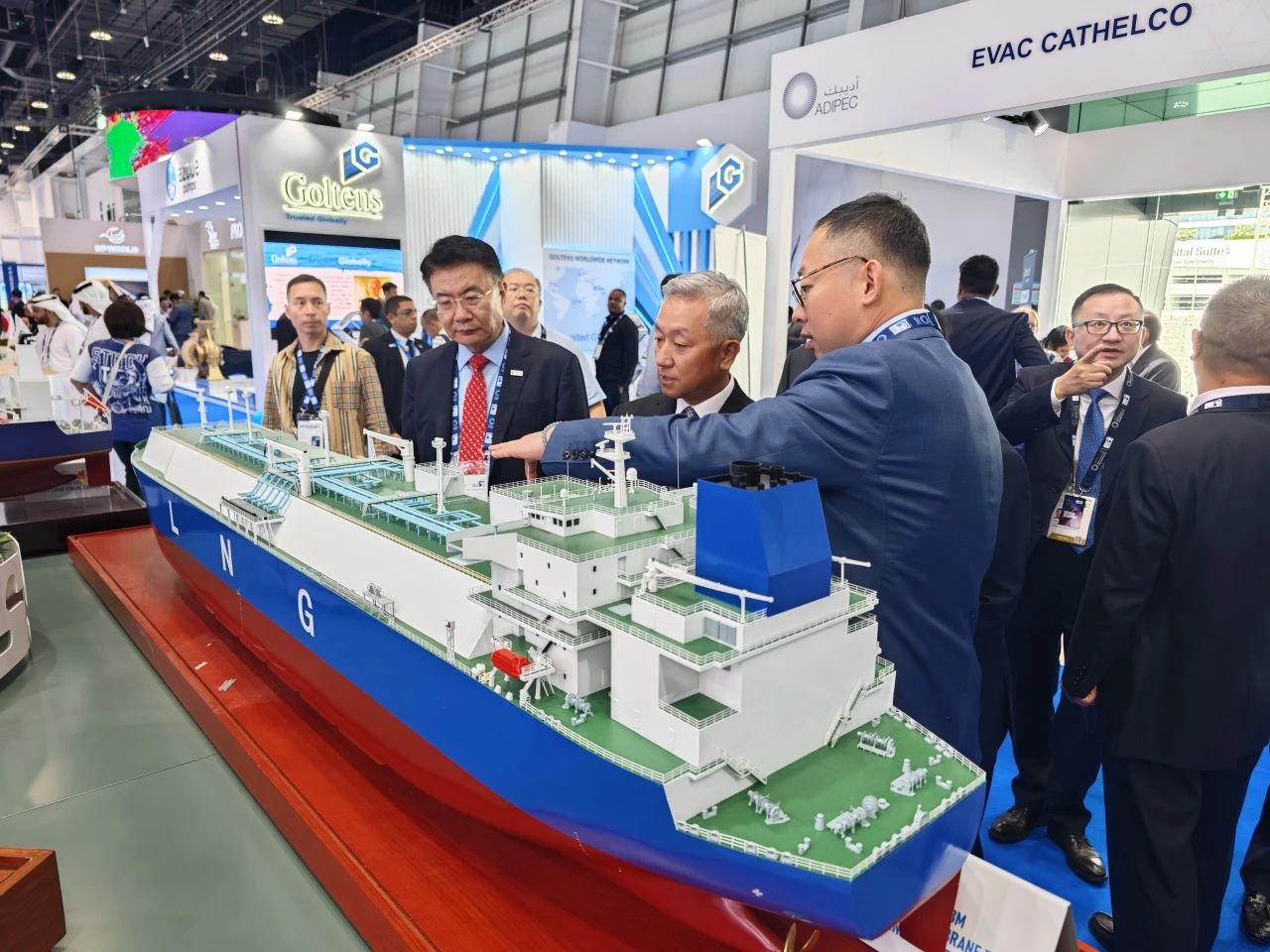 在此次展會上,江南造船展出了自主研發設計的17.5萬立方米液化天然氣(LNG)運輸船、目前世界上最大艙容的99000立方米超大型乙烷運輸船(VLEC)以及93000立方米超大型液氨運輸船(VLAC)等船型,憑借自身優勢及特色展臺布置吸引了眾多油氣公司、船東、船級社、中間商、船廠、供應商等駐足觀看,同時也與其進行了廣泛和深入的交流。值得一提的是,中國駐阿聯酋大使一行也到訪江南造船展臺,詳細詢問江南造船的產品特點、技術和建造優勢。