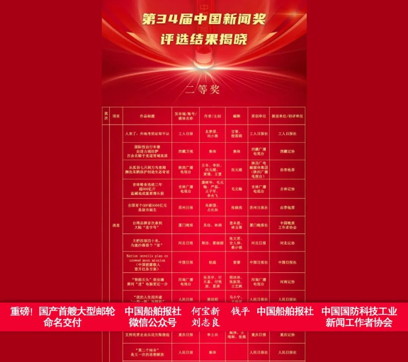11月7日,中華全國新聞工作者協(xié)會主辦的第34屆中國新聞獎評選結(jié)果揭曉。中國國防科技工業(yè)新聞工作者協(xié)會推薦中國船舶報社特約記者何寶新、記者劉志良主創(chuàng)、錢平編輯的作品《重磅!國產(chǎn)首艘大型郵輪命名交付》獲消息類二等獎。