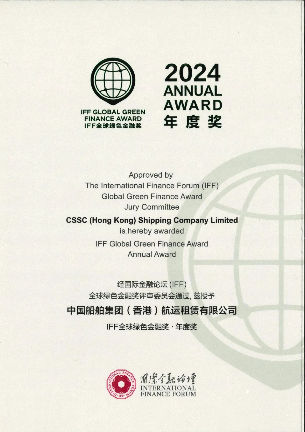 日前,在中國香港舉行的國際金融論壇(IFF)第21屆全球年會(F20峰會)上,發(fā)布了第五屆“IFF全球綠色金融獎”評選結(jié)果。中國船舶集團中船租賃憑借其在綠色金融領(lǐng)域綜合實踐的杰出表現(xiàn),首度榮膺“IFF全球綠色金融獎——年度獎”。這是繼2021年獲得“IFF全球綠色金融創(chuàng)新獎”,中船租賃再上一層樓,榮獲年度大獎。