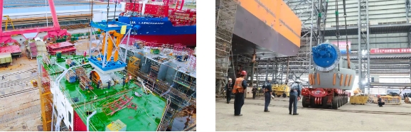 “夢想”號(hào)配備的7臺(tái)推進(jìn)器中,3臺(tái)全回轉(zhuǎn)伸縮推是黃埔文沖迄今總成過的最大伸縮推,并且建造過程中伸縮推需要進(jìn)行全程升降試驗(yàn),升降高度差達(dá)4.3米。完成試驗(yàn)的伸縮推總段重量超過了船廠龍門吊最高900噸的起重能力。“夢想”號(hào)工藝負(fù)責(zé)人馮仕清創(chuàng)新性地提出了采用龍門吊和履帶吊聯(lián)合吊裝的方法,最終保證了伸縮推的成功安裝。