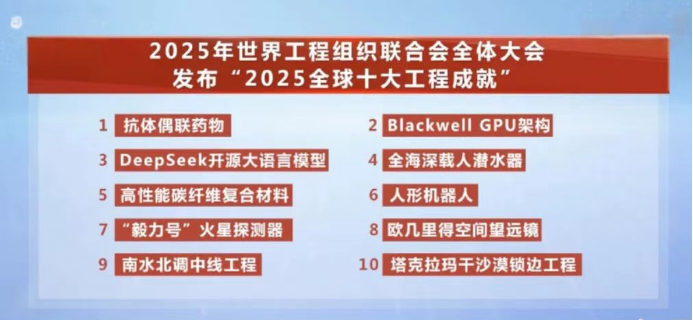 由中國工程院院刊《Engineering(工程)》評選,經由全球征集提名、專家遴選推薦、公眾問卷調查、評選委員會審議后確定,具有高度權威性和國際影響力。本次入選項目涵蓋航天探索、資源開發、人工智能、材料科學等多個領域。與“奮斗者”號全海深載人潛水器一同入選的還有Deepseek開源大語言模型、南水北調中線工程等全球重大工程創新成果。