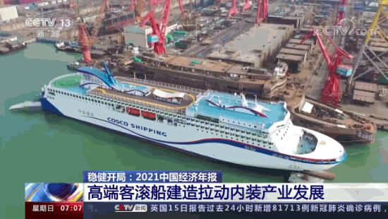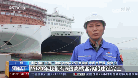 這里是中國船舶廣船國際的造船碼頭,多艘大型豪華客滾船正在緊張調試和建造。負責人告訴記者,2021年,像這樣的高端客滾船他們廠一共建造完工了5艘,產(chǎn)值占比達到約40%。