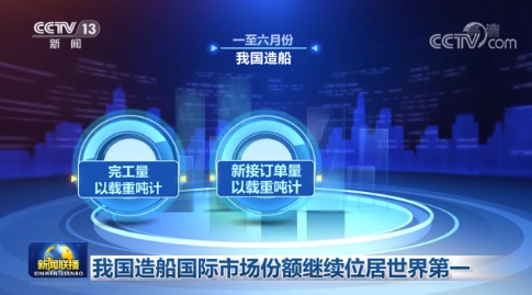 7月17日,央視《新聞聯(lián)播》對(duì)我國造船國際市場份額繼續(xù)位居世界第一進(jìn)行了報(bào)道。數(shù)據(jù)顯示,一至六月份,我國造船完工量、新接訂單量、手持訂單量,以載重噸計(jì)分別占世界總量的45.2%、50.8%和47.8%,國際市場份額繼續(xù)位居世界第一。