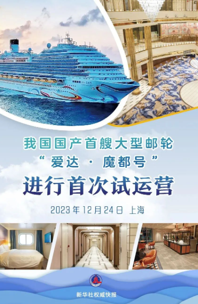 12月24日,國產首艘大型郵輪“愛達·魔都號”在上海吳淞口國際郵輪港離港出海,進行首次試運營。