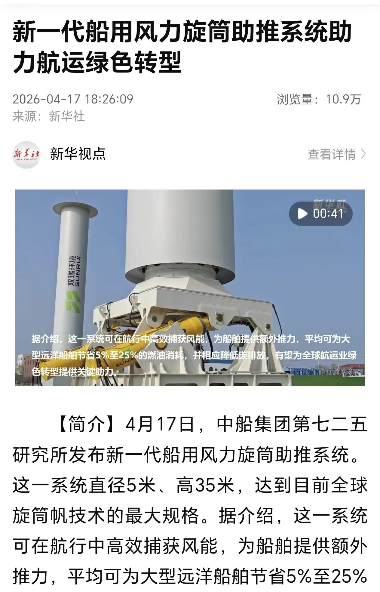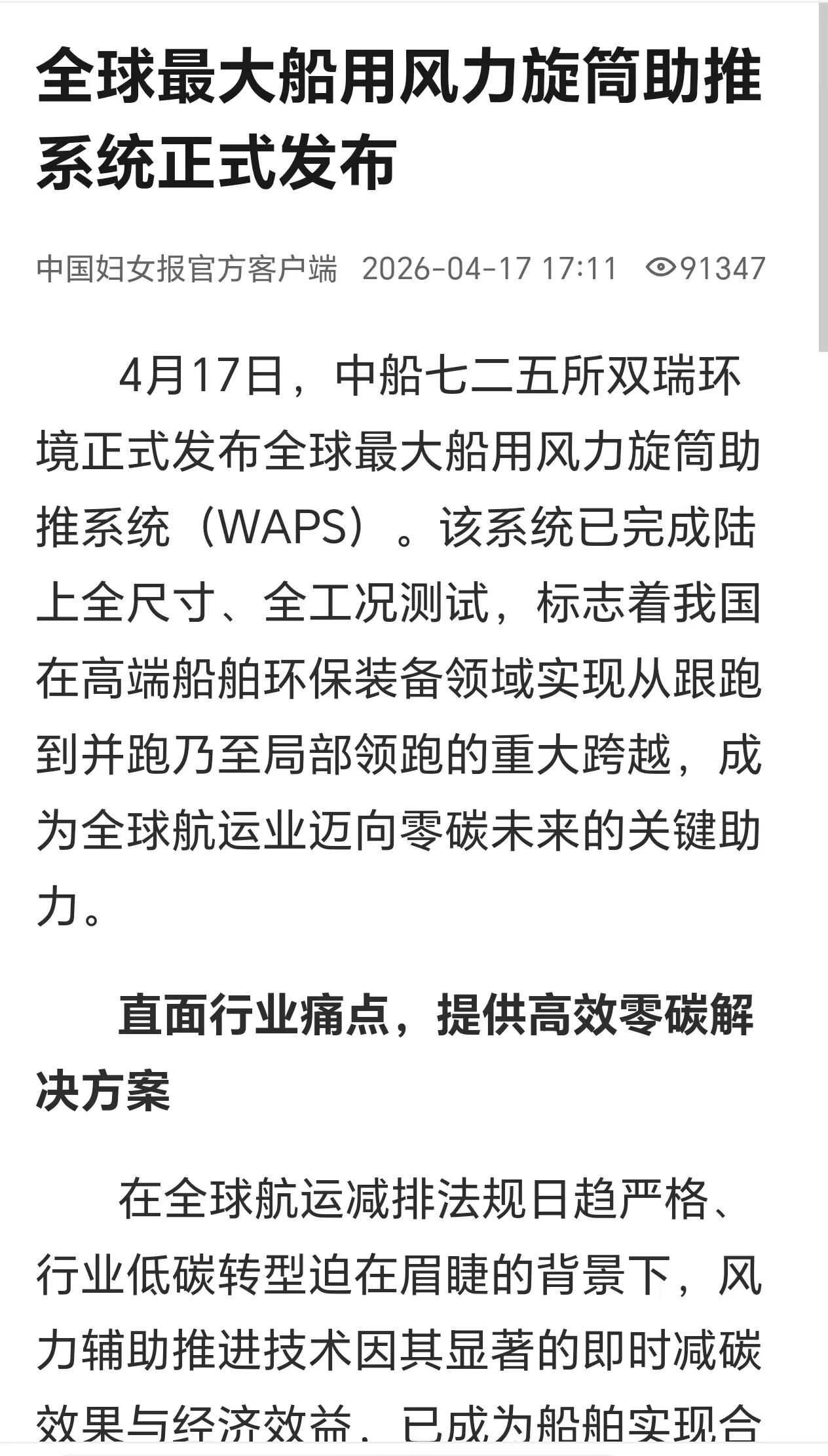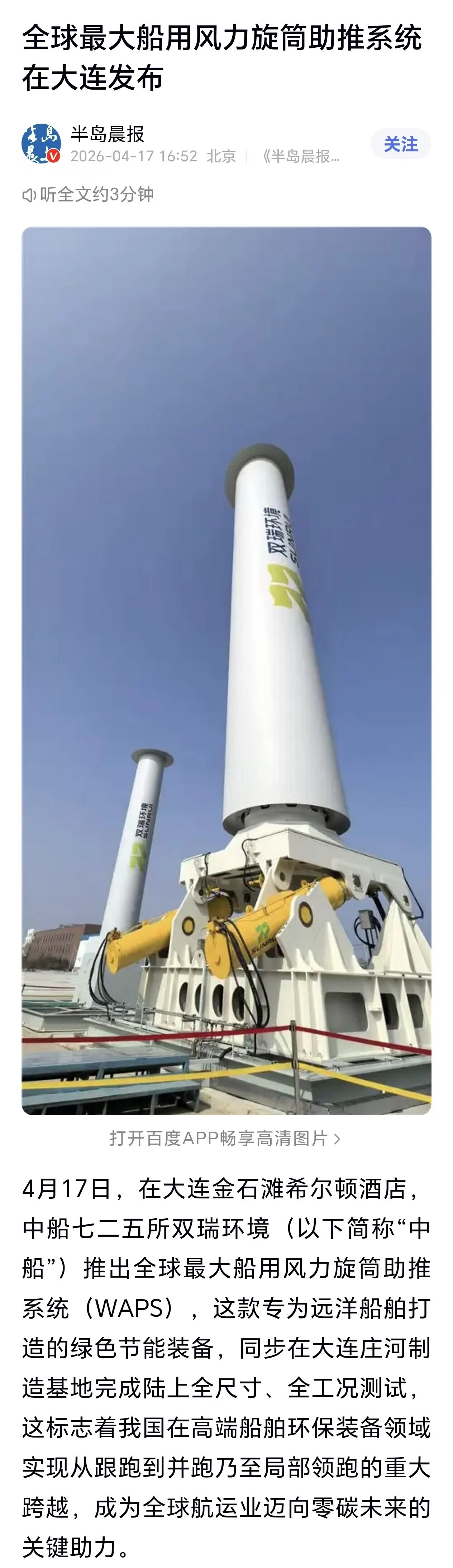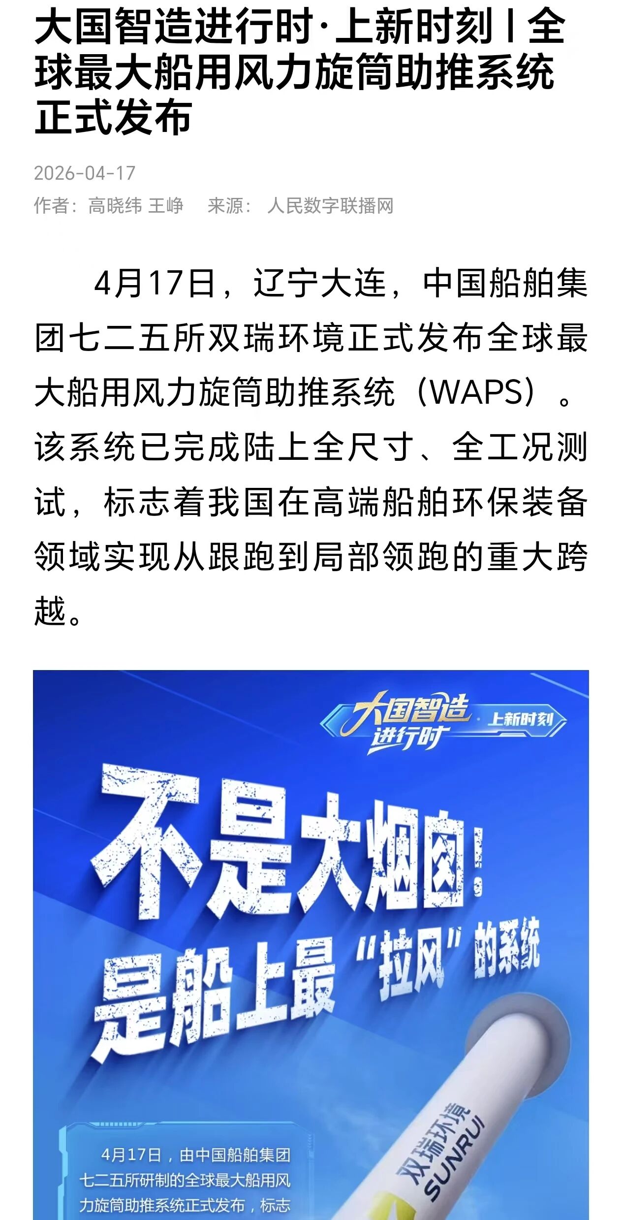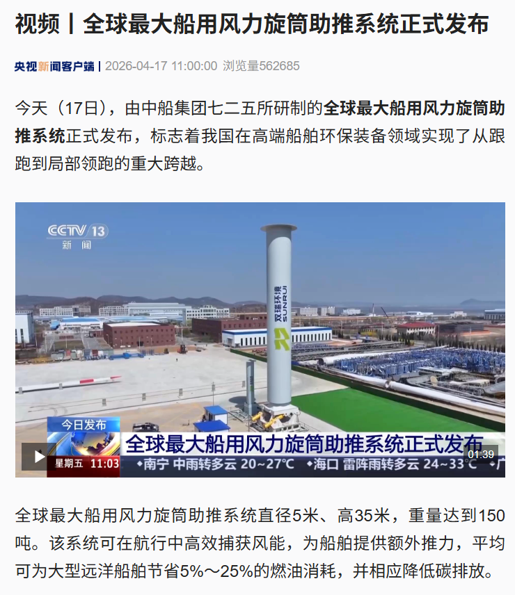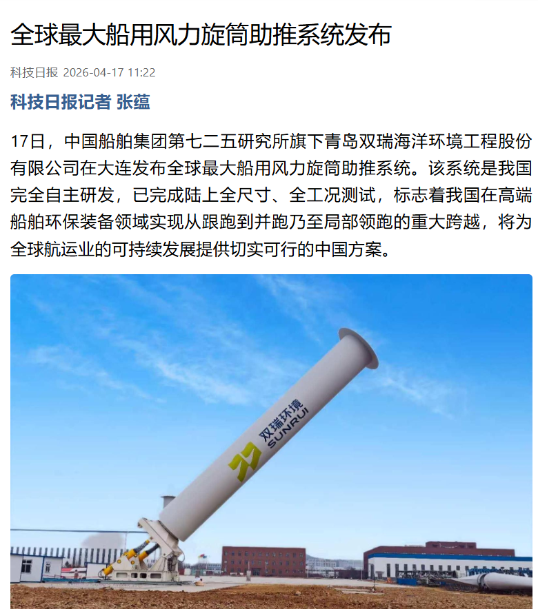4月17日,中國船舶集團(tuán)有限公司七二五所旗下雙瑞環(huán)境正式發(fā)布全球最大船用風(fēng)力旋筒助推系統(tǒng)。 央視、人民日報、新華社、科技日報、半島晨報等多家中央及地方媒體第一時間關(guān)注報道。
