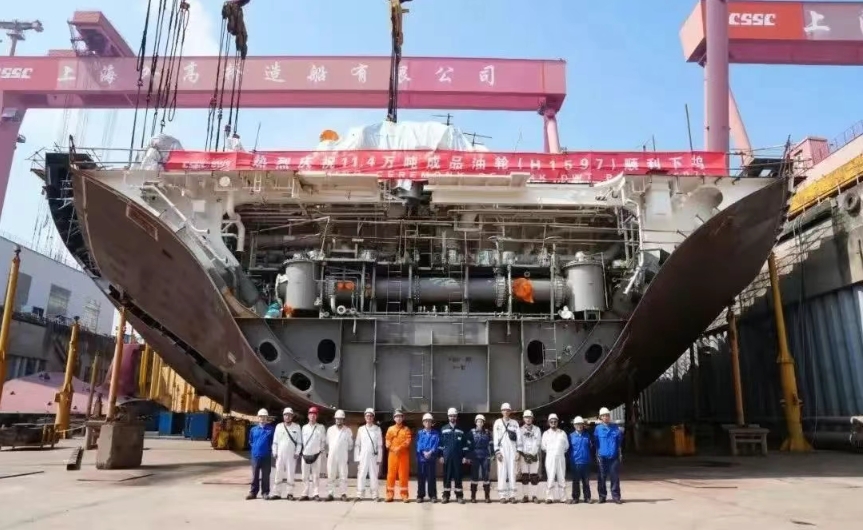 8月4日,為希臘Performance Shipping公司建造的11.4萬噸成品油船順利下塢。該船建造期間,外高橋造船項目團隊以分總段完整性下塢為目標,緊扣“三取消、四清零、工序前移”管理手段開啟總組工作。截至下塢,該船艉半船分段完工率實現100%。